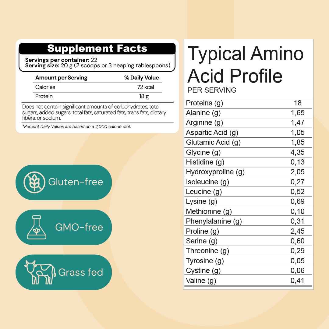 • 20g of Pure Hydrolyzed Collagen: Grass-fed Type I bovine collagen to support firm skin, joint comfort, strong nails, and healthy hair growth.